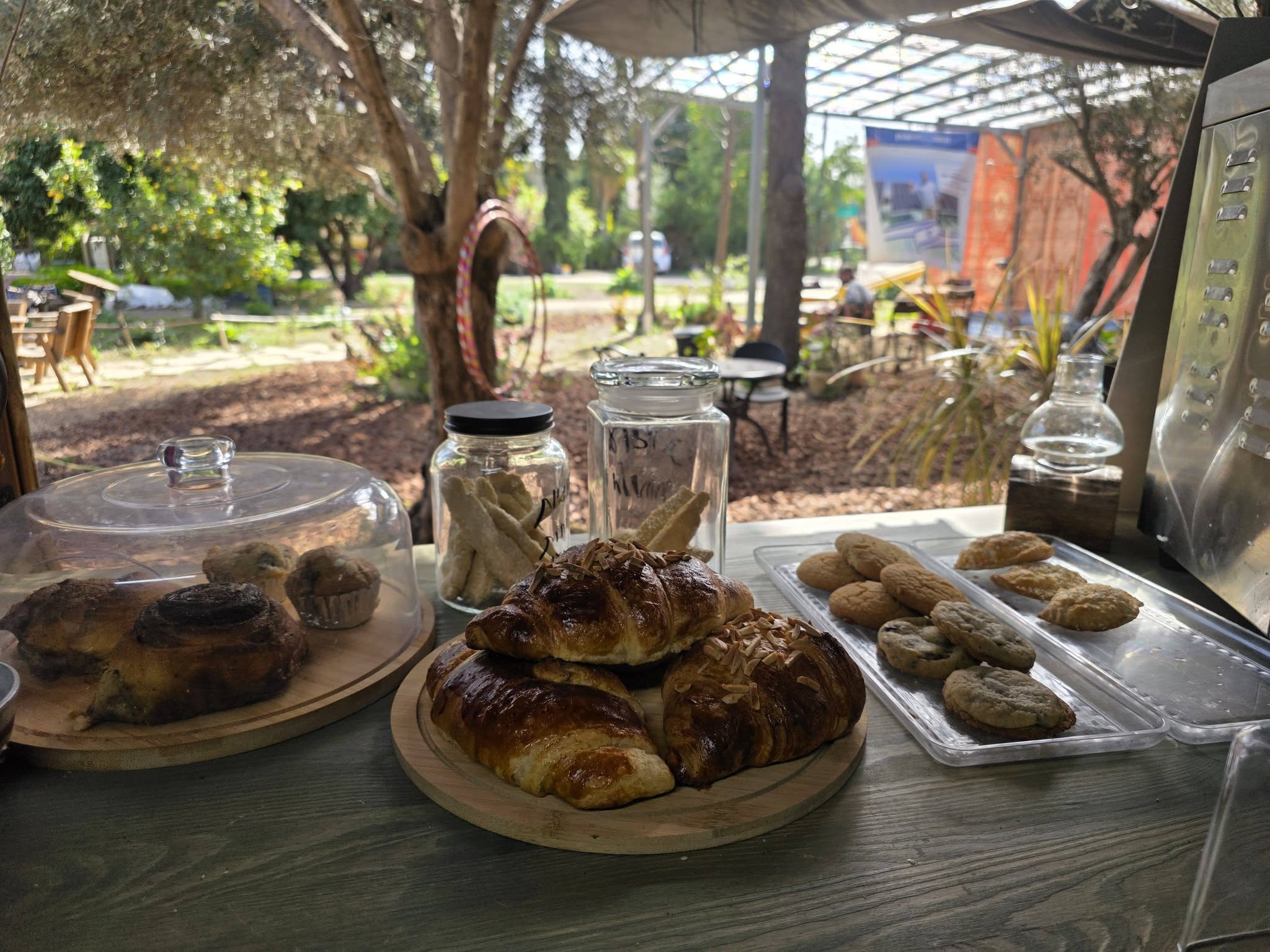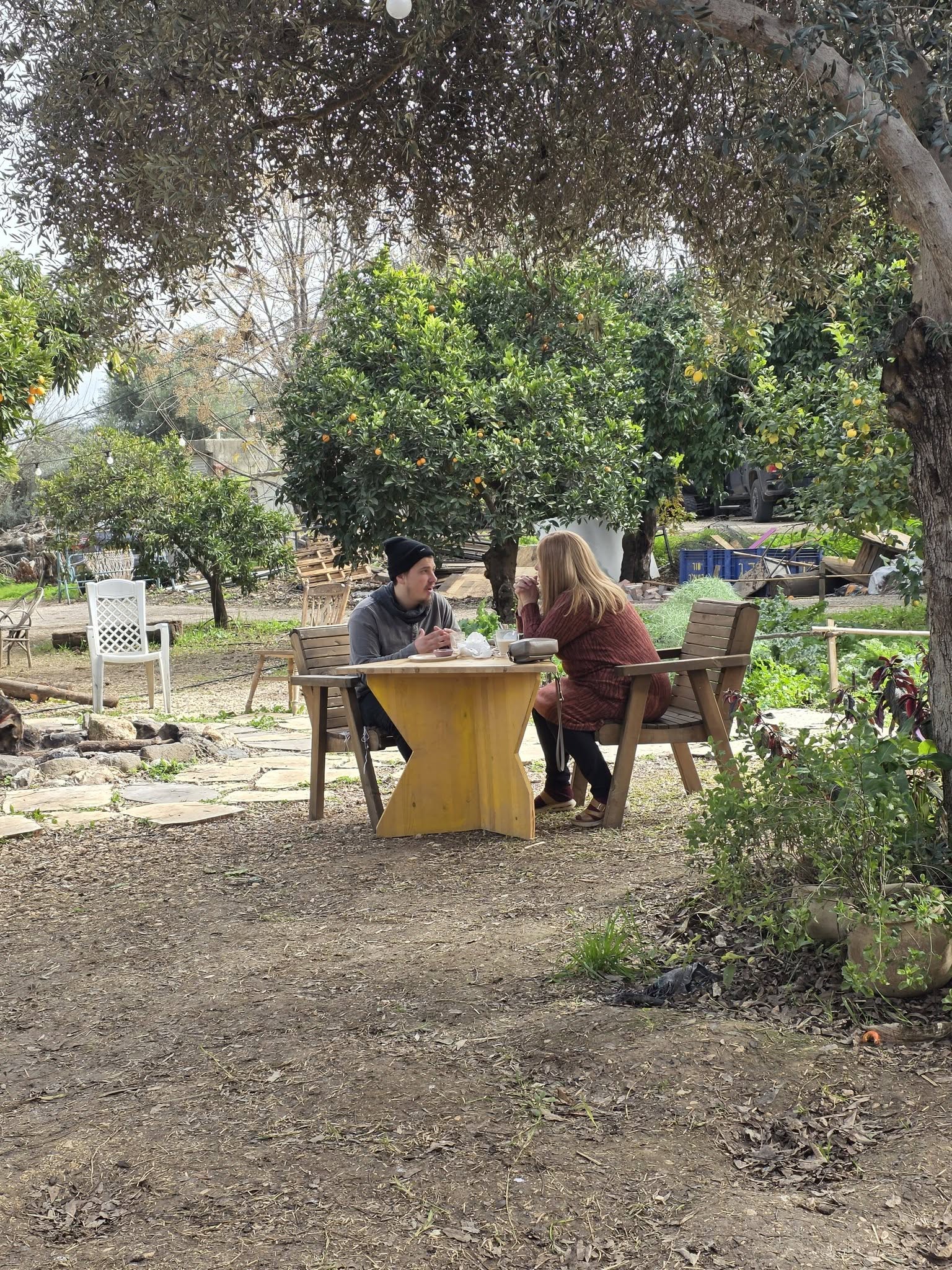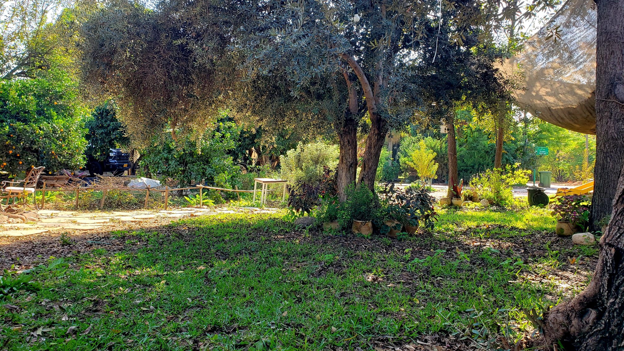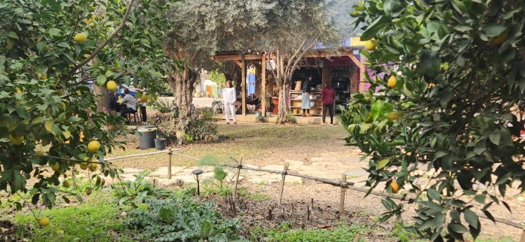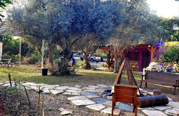 בית הקפה "המקום של ארנון" מוקף עצי פרי וצמחייה ירוקה ופורחת.