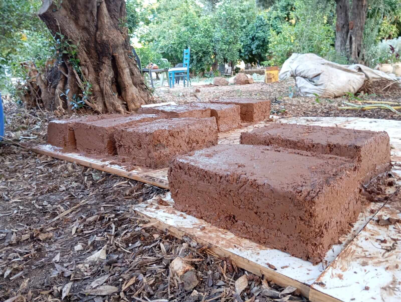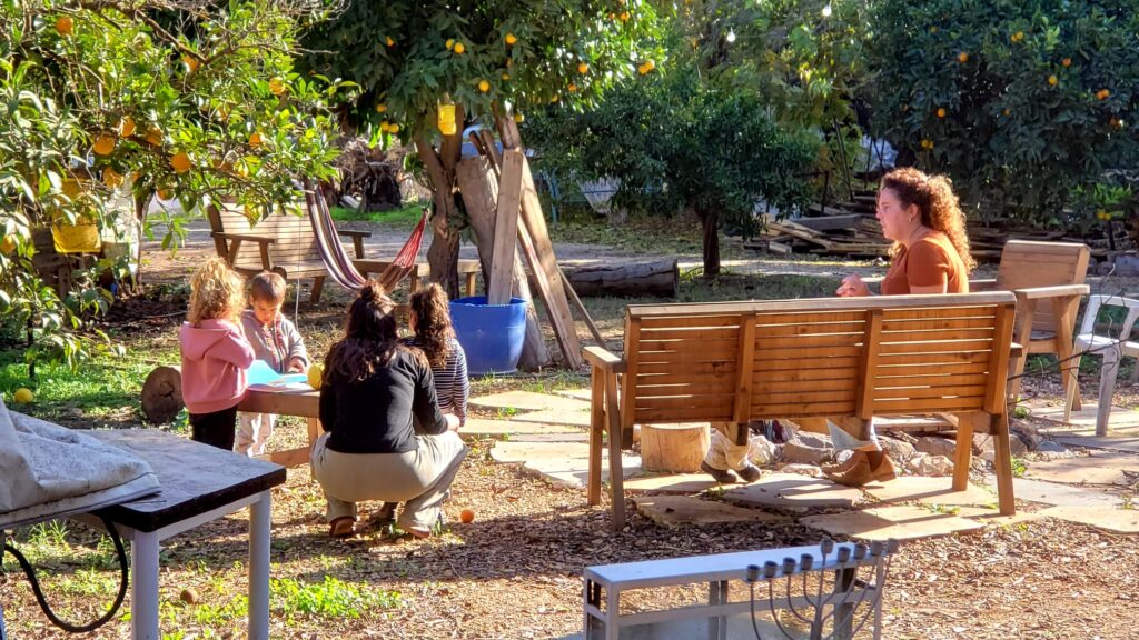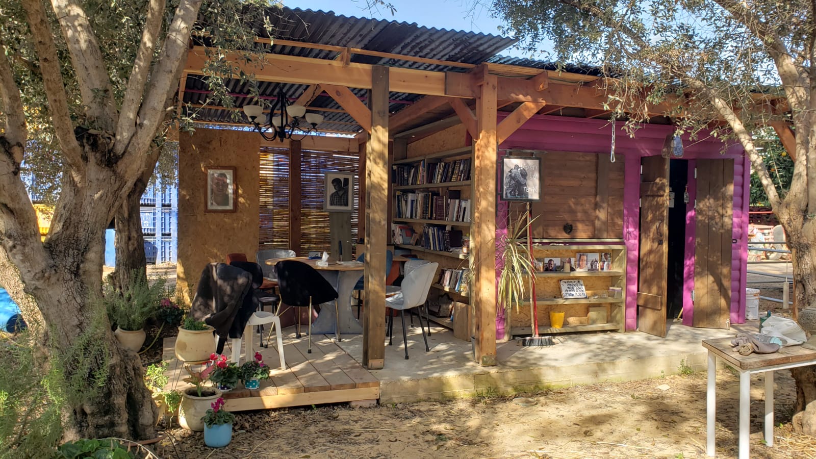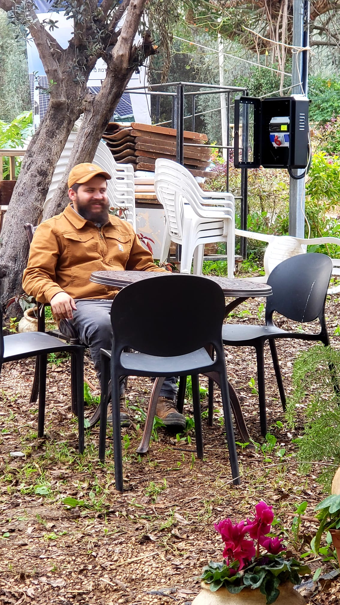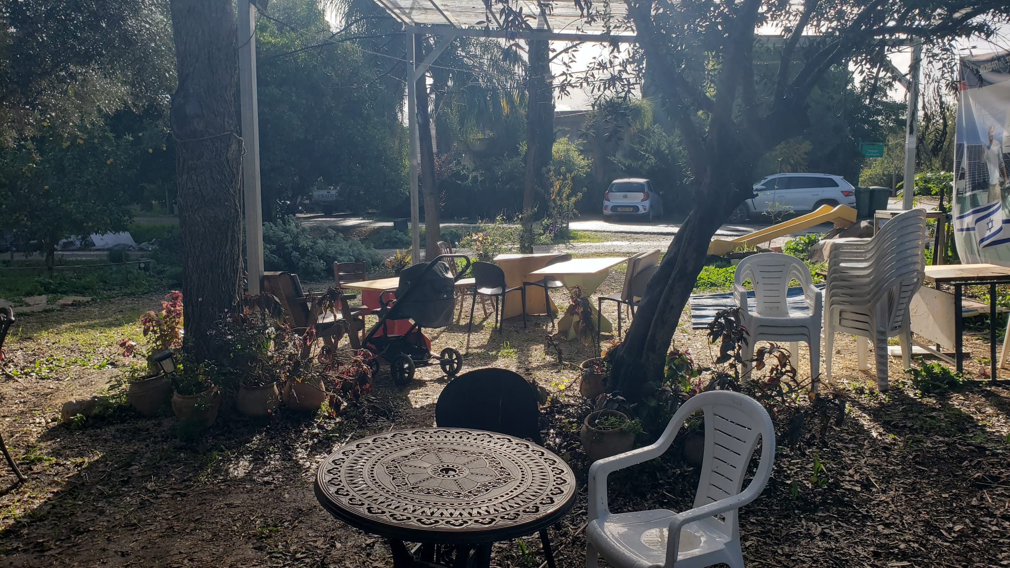 בית הקפה "המקום של ארנון" מוקף עצי פרי וצמחייה ירוקה ופורחת.